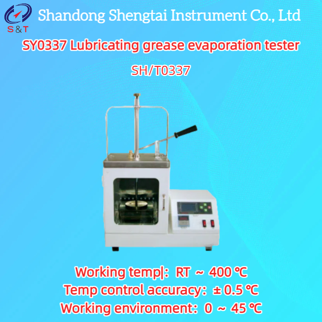 SY0337 Измеритель испарения смазочного масла Этот прибор разработан и изготовлен в соответствии со стандартом SH/T0337 и подходит для измерения испарения смазочного масла. Place an evaporating dish filled with 1mm thick lubricating grease in a specialized thermostat and maintain it at the specified temperature for 1 hour (or as specified in the lubricating grease product standard) to measure the mass loss.